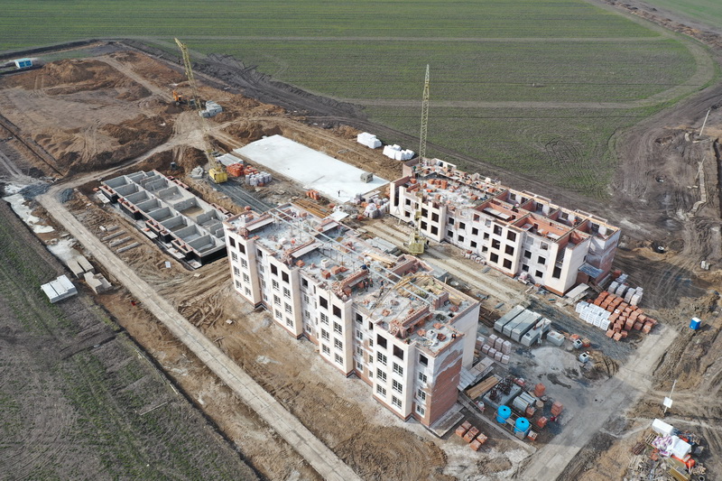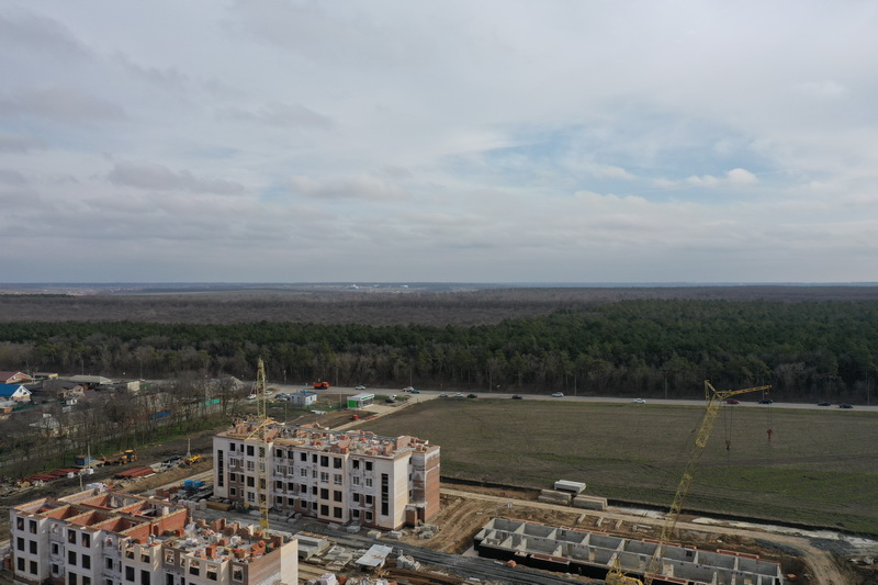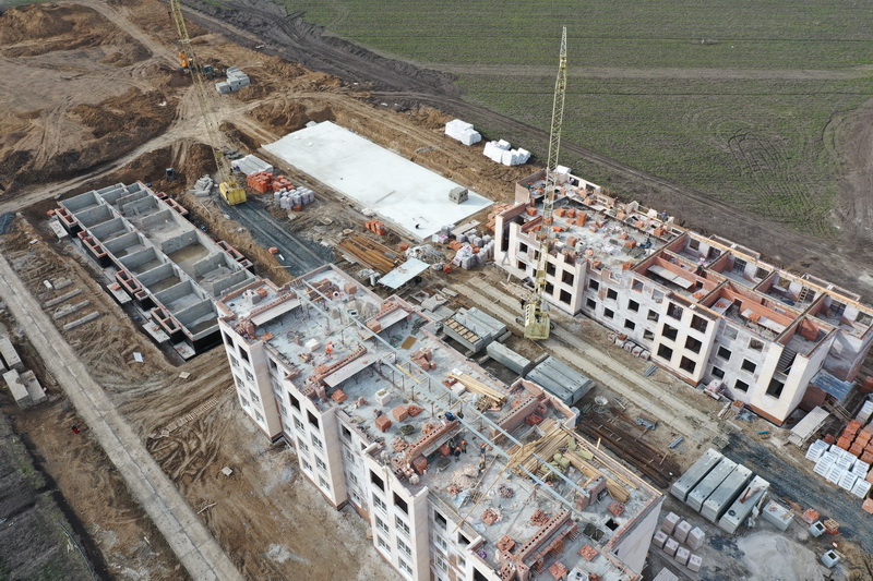 В первом доме ведется монтаж кровли, работы по возведению будут завершены через 3-4 недели. Параллельно заканчивается установка окон на верхних этажах.
