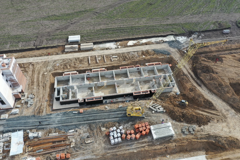 Третий дом - закончен монтаж цокольного этажа, идет засыпка фундаментных плит и строители приступают к кирпичной кладке 1 этажа.